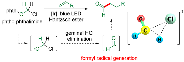 脂肪醛广泛存在于生物活性分子,是重要的有机合成砌块,通过自由基氢甲酰化反应引入醛基是颇具吸引力的合成策略。然而,目前可用于有机合成的甲酰自由基生成方法仍然未知。近日,中国科学院上海有机化学研究所生命有机化学国家重点实验室陈以昀课题组与郑州大学蓝宇课题组合作,发展了可见光催化温和条件下生成甲酰自由基的新方法,即甲酰自由基前体α-氯-N-甲氧基酞酰亚胺化学性质稳定且易得。该方法可在常温常压下对缺电子烯烃进行自由基氢甲酰化反应选择性地合成脂肪醛。机理实验和理论计算验证了氯甲氧自由基通过氯化氢协同消除反应生成甲酰自由基的机理(Angew. Chem., Int. Ed. 2022, e202213686)。